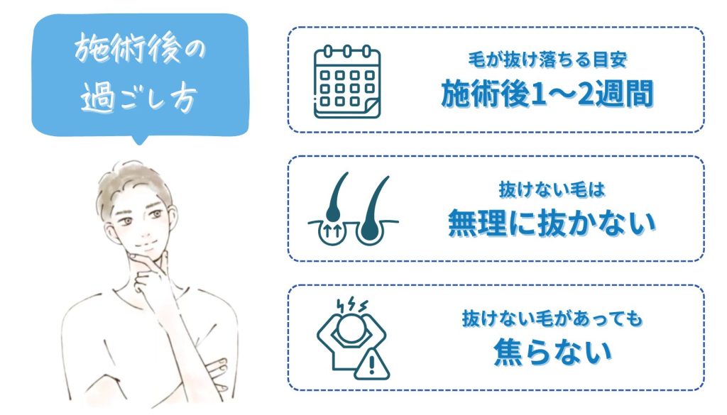 施術直後にすぐ抜けるわけではなく、毛根へのダメージによって徐々に支えを失った毛が、自然と排出されるのを待つ必要があります。