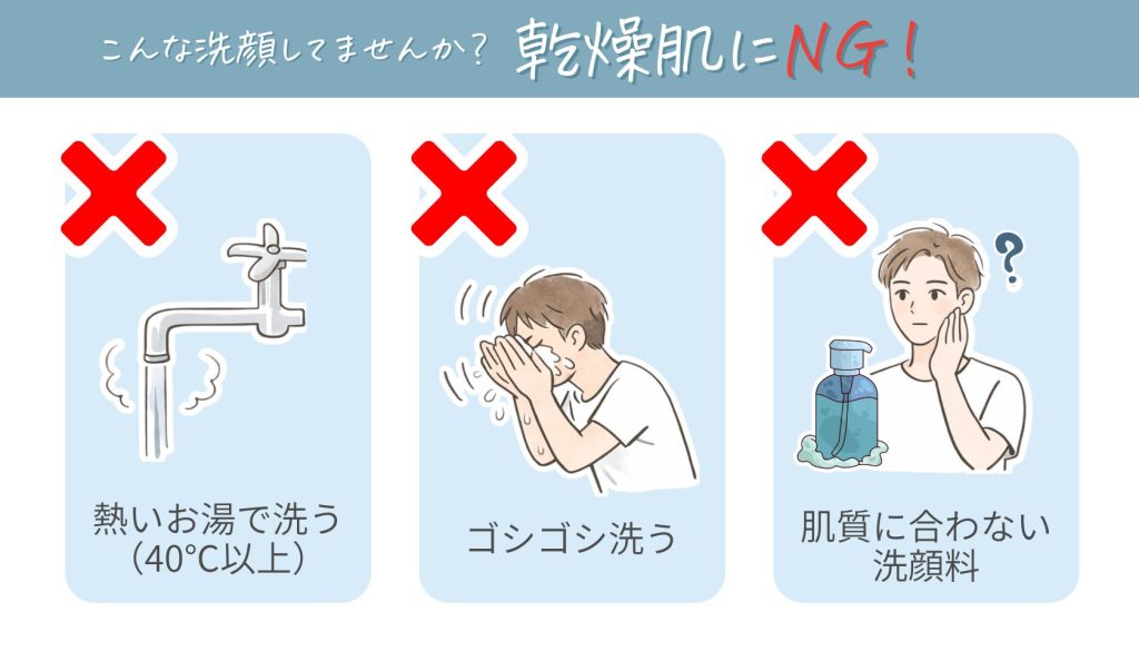 洗顔時の温度設定は乾燥対策に直結します。40度を超える熱いお湯は、肌に必要な皮脂まで溶かし出してしまうため、乾燥を悪化させる大きな要因です。
