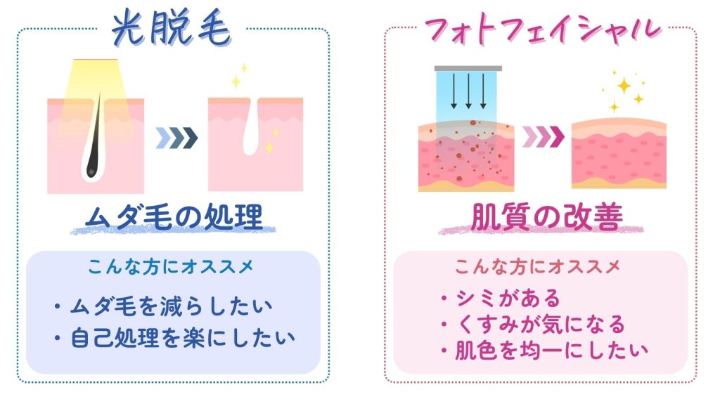 ムダ毛を減らしたいなら光脱毛、肌の印象を整えたいならフォトフェイシャルが向いています。