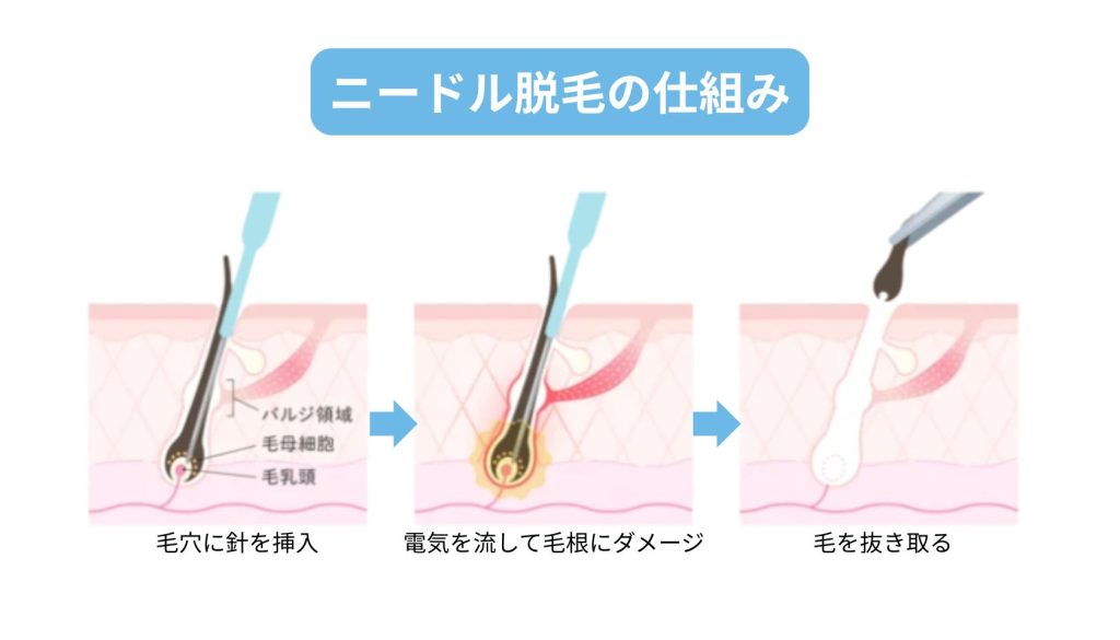 美容電気脱毛は、毛穴の一つひとつに絶縁針(肌に触れる部分がコーティングされた細い器具)を挿入し、毛根部に直接微弱な電気を流します。